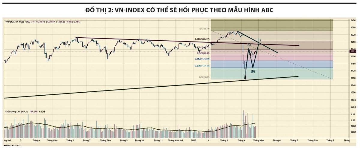 Sự tiêu cực đó phần nhiều đang đến từ tính bất ổn toàn cầu. Chuỗi phát ngôn khó lường về thuế quan của Tổng thống Donald Trump đã không dừng lại ở truyền thông Mỹ, mà đang hiện hữu chảy vào các báo cáo điều chỉnh giảm kỳ vọng tăng trưởng ở nhiều khu vực trên toàn cầu. Sức ép lớn nhất của nhà đầu tư ngắn hạn hiện tại là sự tiêu cực này chưa có dấu hiệu của sự kết thúc. Sự hân hoan của thị trường khi Mỹ tạm ngừng áp thuế 90 ngày được nhiều tổ chức đánh giá chỉ là ngắn hạn. Mặc dù vậy, giai đoạn từ nay cho tới khi câu chuyện thuế quan trở nên rõ ràng hơn có thể là cơ hội để VN-Index hồi phục theo mẫu hình ABC (xem đồ thị 2).