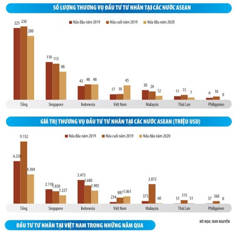 Do tác động của Covid-19, các hoạt động giao dịch đầu tư tư nhân của ASEAN-5 và Việt Nam đã chậm lại sau năm 2019 sôi động. Số lượng giao dịch giảm từ 230 trong nửa cuối năm 2019, còn 200 trong 6 tháng đầu năm 2020. Giá trị thương vụ giảm hơn một nửa, từ 9.152 triệu USD, còn 4.304 triệu USD.