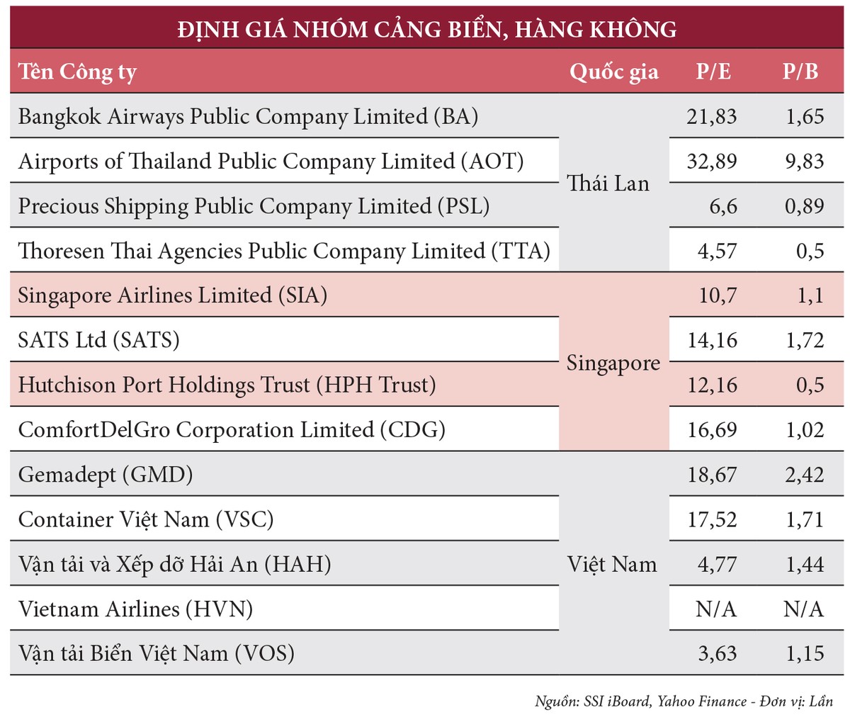 Theo thống kê về định giá của các doanh nghiệp vận tải như CTCP Vận tải và Xếp dỡ Hải An (mã HAH), CTCP Vận tải biển Việt Nam (mã VOS) đang có mức định giá thấp hơn khu vực với P/E dưới 5 lần và P/B dưới 1,5 lần, tương đối hấp dẫn so với khu vực.