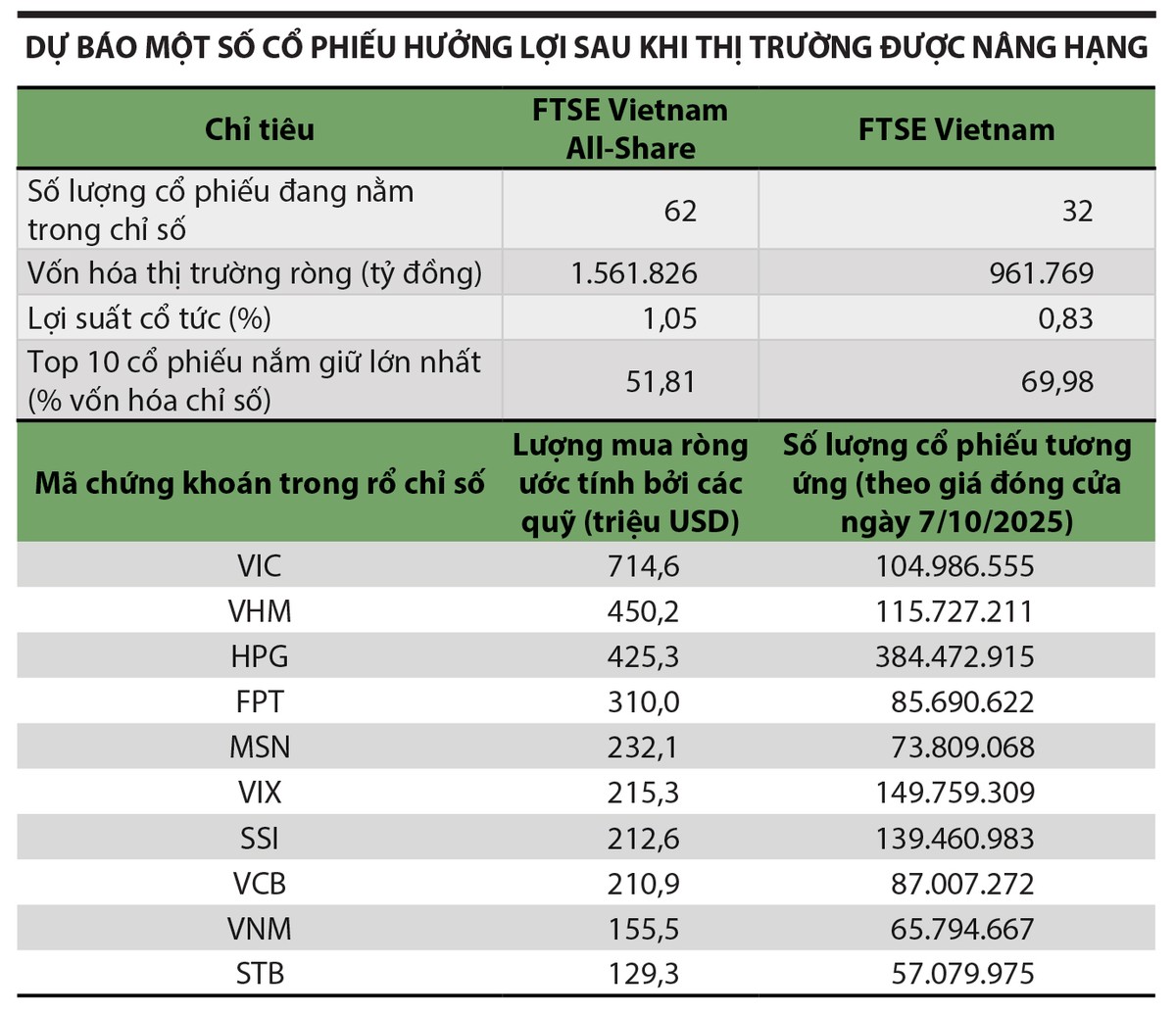 Hiện có 62 cổ phiếu trong rổ FTSE Vietnam All-Share, trong đó 32 mã thuộc FTSE Vietnam Index sẽ hưởng lợi trực tiếp khi Việt Nam gia nhập nhóm thị trường mới nổi thứ cấp. Các tiêu chí sàng lọc gồm vốn hóa trên 150 triệu USD, tỷ lệ cổ phiếu tự do lưu hành (free-float) tối thiểu 5% và room ngoại còn lại từ 20%.