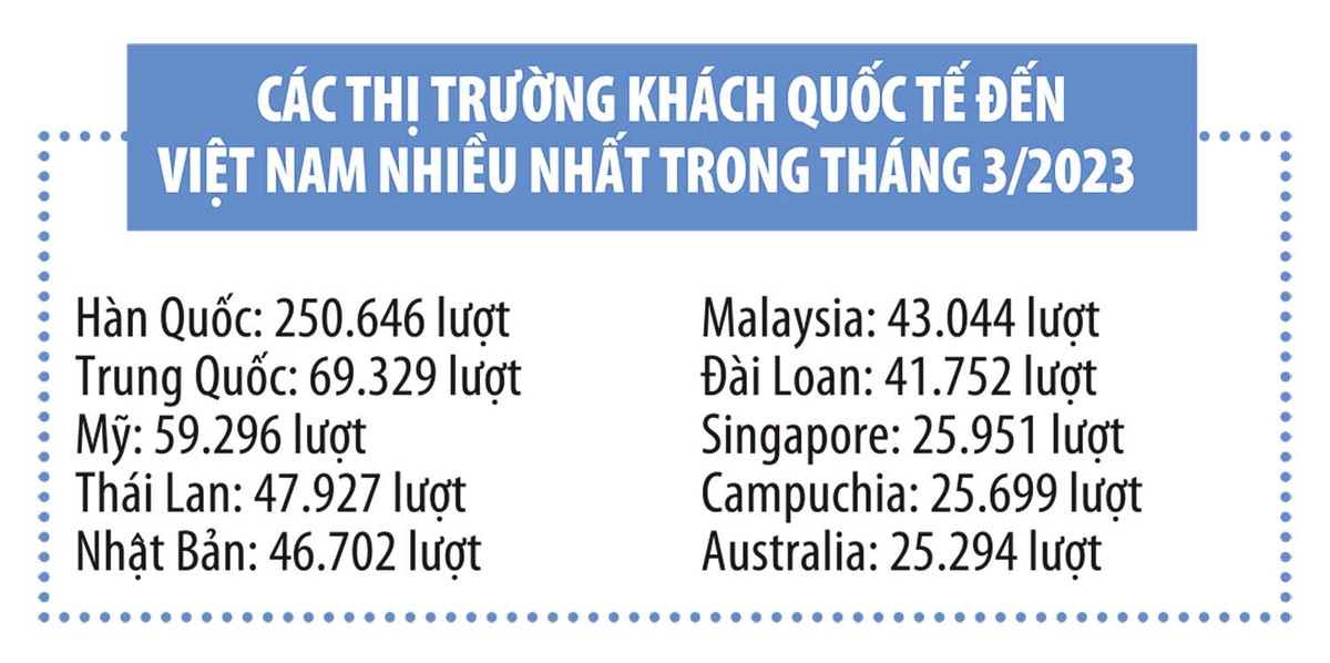 Theo Tổng cục Thống kê, quý I/2023, khách quốc tế đến Việt Nam ước đạt hơn 2,7 triệu lượt, gấp 29,7 lần cùng kỳ năm trước, nhưng vẫn chỉ bằng 60% so với cùng kỳ năm 2019. Như vậy, sau quyết định mở cửa trở lại nền kinh tế từ thời điểm 15/3/2022, khách quốc tế đến Việt Nam đã tăng trở lại, song vẫn còn khoảng cách khá xa so với thời điểm trước dịch.