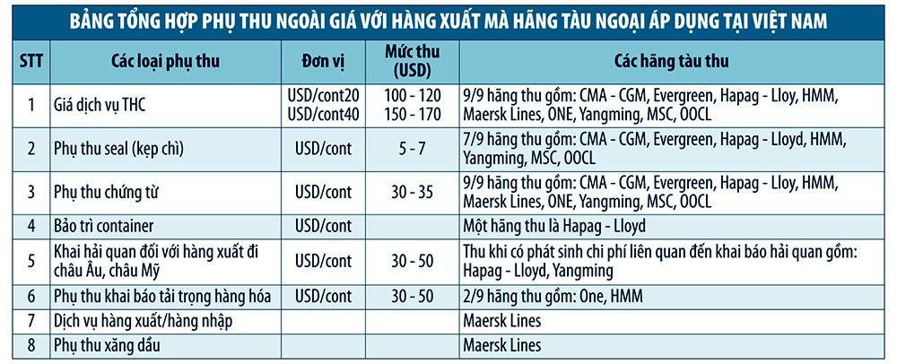 Qua kiểm tra và báo cáo của các hãng tàu, Cục Hàng hải Việt Nam ghi nhận, trung bình mỗi hãng tàu đang áp dụng từ 3 - 5 loại phụ thu đối với các hàng hóa xuất khẩu và hàng hóa nhập khẩu. Trong đó, THC chiếm tỷ trọng lớn nhất, dao động từ 100 dến 170 USD/container và đang được 9/9 hãng tàu ngoại khai thác tuyến châu Âu, Bắc Mỹ thu.
