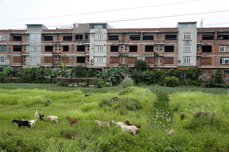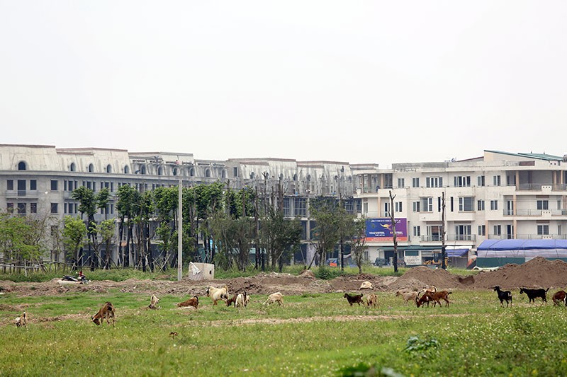Con dê đang gặm cỏ tại khu đất trống trong Khu đô thị Phú Lương, không xa là biệt thự khủng xây dựng không phép