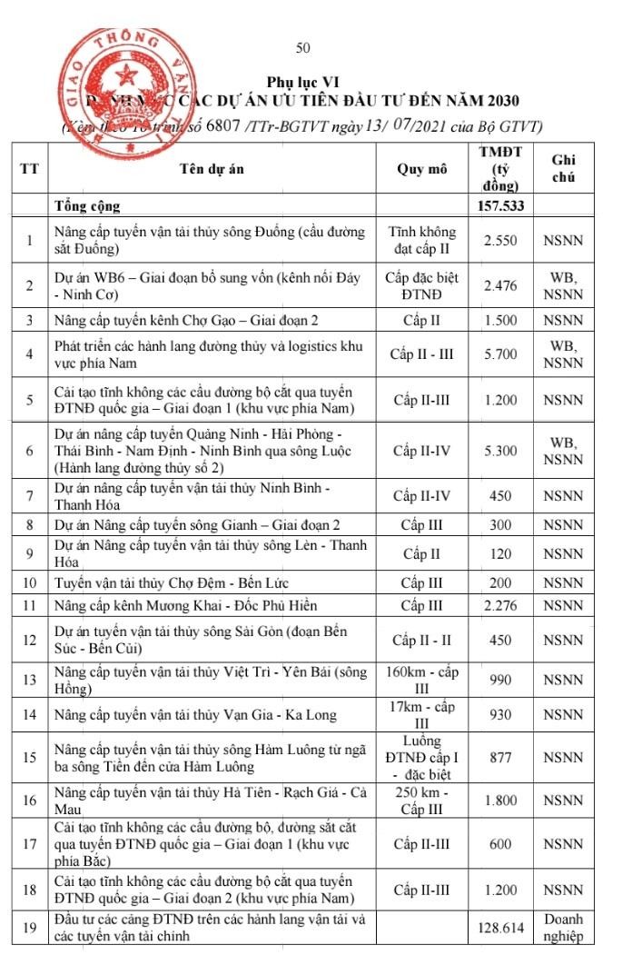 Tại tờ trình số 6807, Bộ GTVT cũng lên danh mục 17 dự án hạ tầng đường thủy ưu tiên đầu tư từ nay đến năm 2030 với tổng mức đầu tư lên tới 157.533 tỷ đồng.