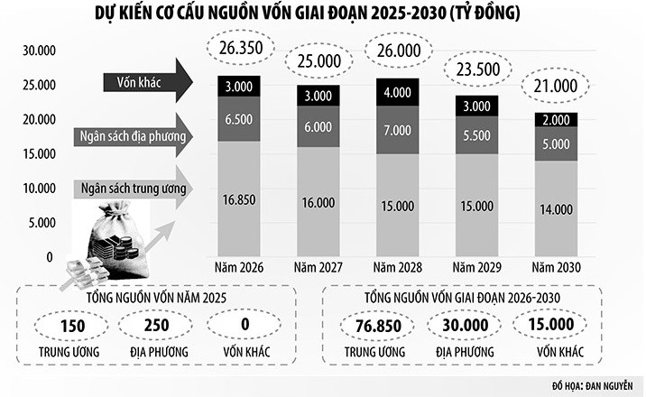 Tổng nguồn lực huy động để thực hiện Chương trình giai đoạn 2025-2030 dự kiến là 122.250 tỷ đồng, gồm vốn ngân sách trung ương hỗ trợ trực tiếp để thực hiện Chương trình giai đoạn 2025-2030 được bố trí tối thiểu khoảng 77.000 tỷ đồng (chiếm 63%), trong đó vốn đầu tư phát triển 50.000 tỷ đồng, vốn sự nghiệp 27.000 tỷ đồng; vốn ngân sách địa phương khoảng 30.250 tỷ đồng (chiếm 24,6%), bao gồm vốn đầu tư phát triển 18.000 tỷ đồng, vốn sự nghiệp 12.250 tỷ đồng; vốn huy động hợp pháp khác dự kiến khoảng 15.000 tỷ đồng (chiếm 12,4%).