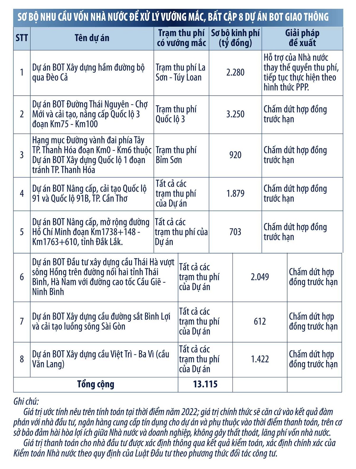 Tại Tờ trình số 10189, Bộ GTVT kiến nghị Chính phủ trình Quốc hội chấp thuận chủ trương giải pháp thực hiện và bố trí vốn ngân sách nhà nước (khoảng 13.115 tỷ đồng) để thanh toán cho nhà đầu tư/doanh nghiệp dự án của 7 dự án (khoảng 10.835 tỷ đồng) và bổ sung vốn nhà nước (khoảng 2.280 tỷ đồng) hỗ trợ Dự án Xây dựng hầm đường bộ qua Đèo Cả. Đồng thời, kiến nghị Quốc hội giao Chính phủ chỉ đạo rà soát, hoàn thiện pháp luật về PPP, bảo đảm công bằng, hài hòa lợi ích giữa các bên, khả thi về tổ chức thực hiện.