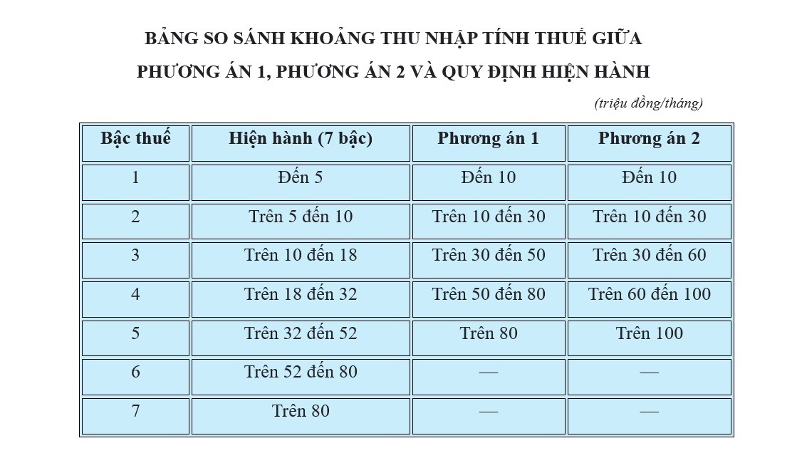 Bộ Tài chính nhận định, sau khi rà soát cơ cấu biểu thuế hiện hành và nghiên cứu xu hướng cải thiện mức sống, cũng như kinh nghiệm quốc tế, có thể nghiên cứu cắt giảm số bậc thuế hiện nay từ 7 bậc xuống mức phù hợp, đồng thời nới rộng khoảng cách thu nhập giữa các bậc để điều tiết cao hơn đối với người có thu nhập cao. Việc này sẽ góp phần đơn giản hóa biểu thuế, giảm số bậc thuế nhằm tạo thuận lợi cho việc kê khai, nộp thuế của người nộp thuế.