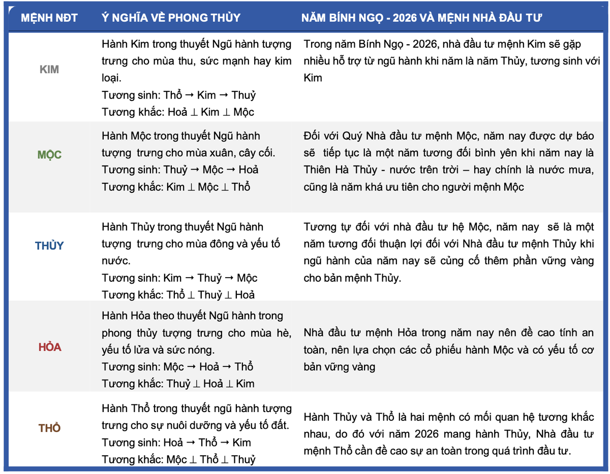 BSC nhận thấy, ứng dụng học thuyết này vào đầu tư chứng khoán là phương pháp tham khảo, khi kết hợp ngũ hành theo năm sinh của nhà đầu tư với ngũ hành ngành và ngũ hành của năm 2026 để chọn lọc các mã chứng khoán theo phân tích cơ bản nhưng có thêm yếu tố phù hợp phong thủy.