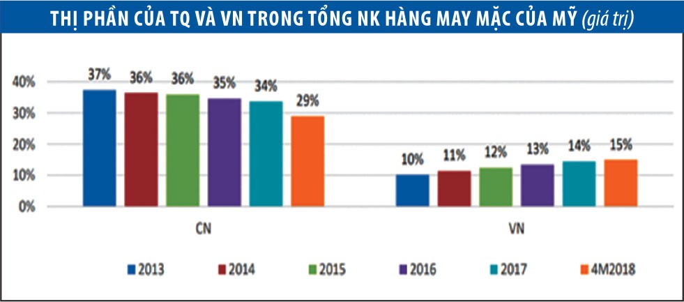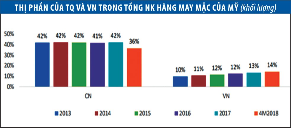 Theo số liệu của OTEXA, trong giai đoạn 2013-2018, thị phần của Việt Nam trong tổng nhập khẩu hàng may mặc của Mỹ tăng cả về khối lượng lẫn giá trị, trong khi thị phần của Trung Quốc liên tục sụt giảm.