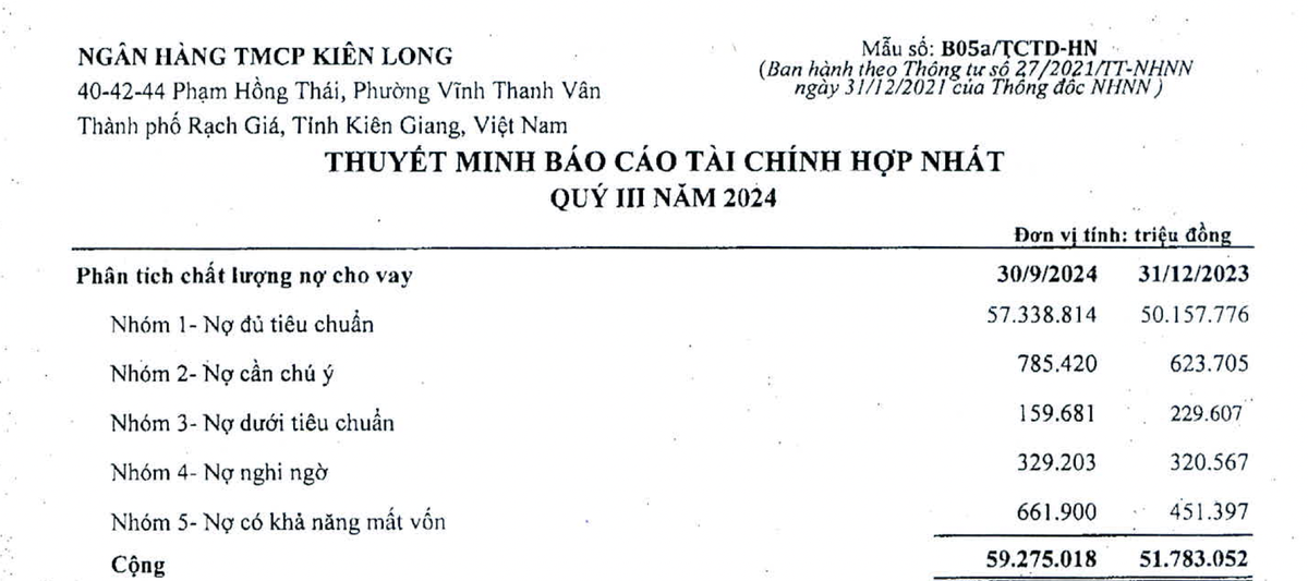 Đến cuối quý III, tổng tài sản KienlongBank ở mức 91.827 tỷ đồng, tăng 5,6% so với đầu năm. Trong đó, dư nợ cho vay khách hàng đạt 59.275 tỷ đồng, tăng 14,4%. Tiền gửi đạt 60.041 tỷ đồng, tăng 5,5%. Số dư nợ xấu ở mức 1.151 tỷ đồng, tương ứng tỷ lệ 1,94%.