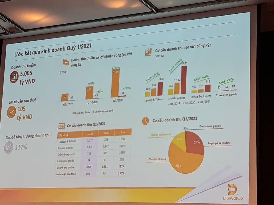 Năm 2021, DGW đặt mục tiêu doanh thu 15.200 tỷ đồng, lợi nhuận sau thuế 300 tỷ đồng. Trong đó, mảng laptop dẫn đầu mức tăng với 59%, mảng điện thoại di động cũng lạc quan với mức tăng 55%, dự đóng góp 7.500 tỷ đồng vào doanh thu chung.