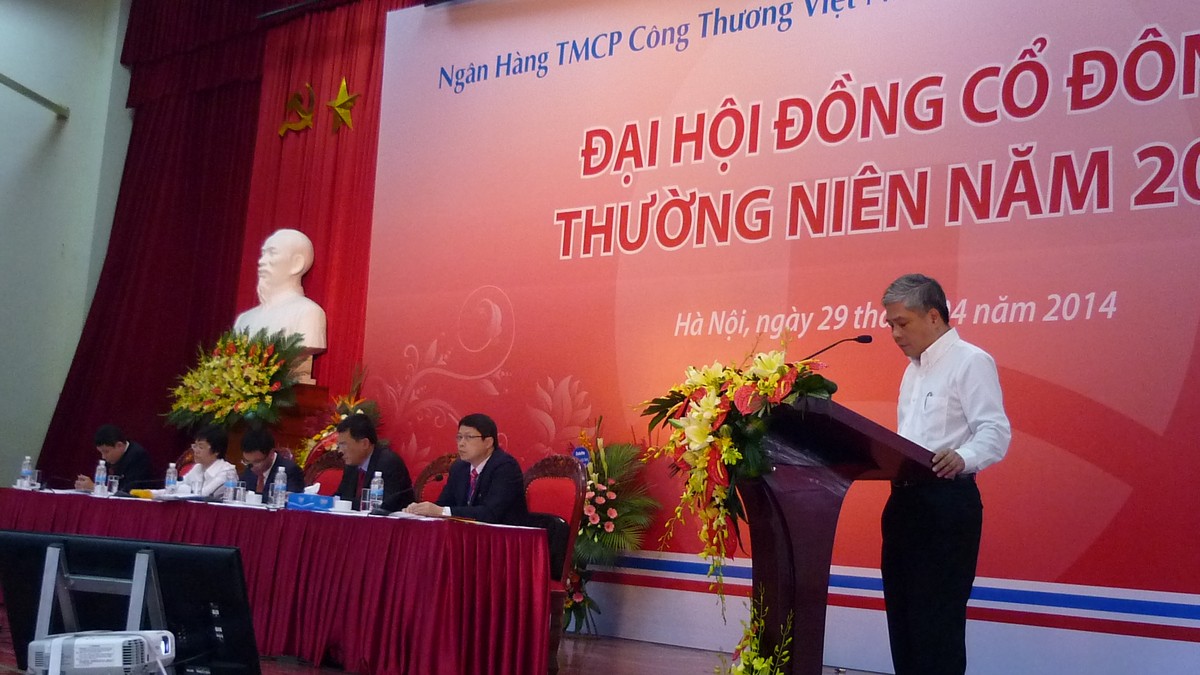 10h30: Ông Phạm Huy Hùng trình bày tại ĐHCĐ về việc bầu nhân sự thành viên HĐQT 2014-2019, ông Hùng trình ĐHCĐ số lượng thành viên HĐQT được bầu. Theo đó, điều lệ của ngân hàng là 11 thành viên, trong đó có 1 thành viên độc lập. Tuy nhiên dựa theo đặc thù hoạt động tại nhiệm kỳ này, NHNN chấp thuận thông qua số lượng thành viên được bầu vào HĐQT Vietinbank tại ĐHCĐ 2014 này là 7 thành viên, thời hạn 5 năm.