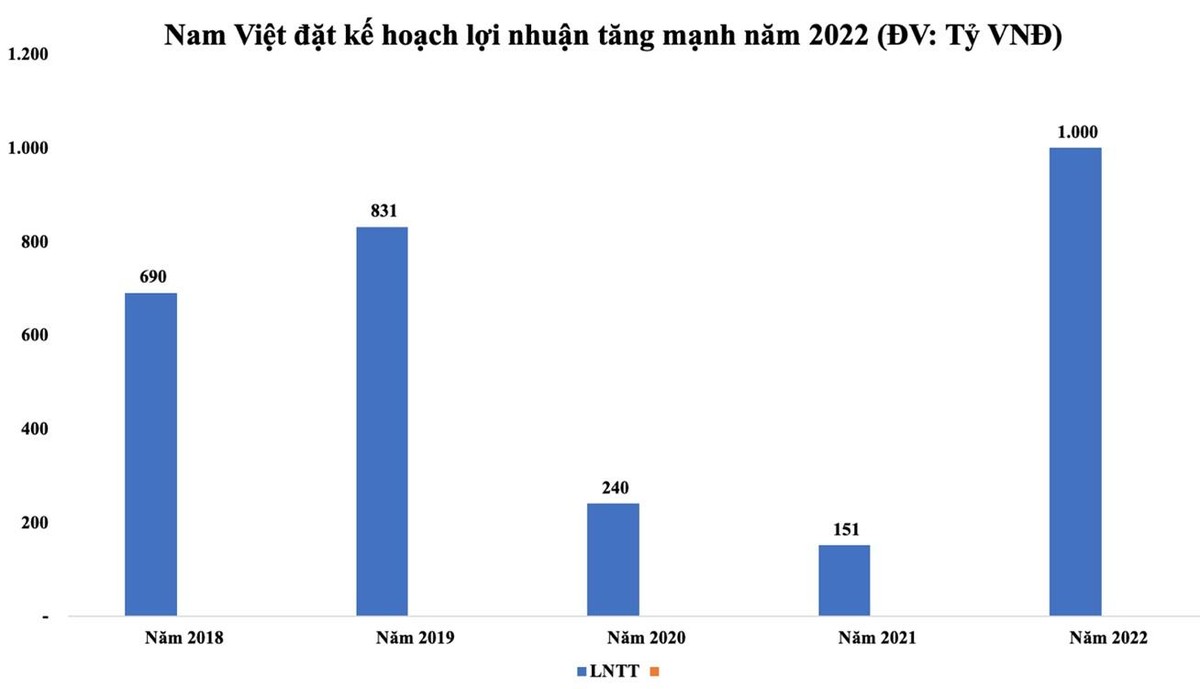 Trong năm 2022, Nam Việt đặt kế hoạch tổng doanh thu 4.900 tỷ đồng và lợi nhuận trước thuế 720 tỷ đồng, lần lượt tăng trưởng 40,2% và 376,8% so với thực hiện trong năm 2021.