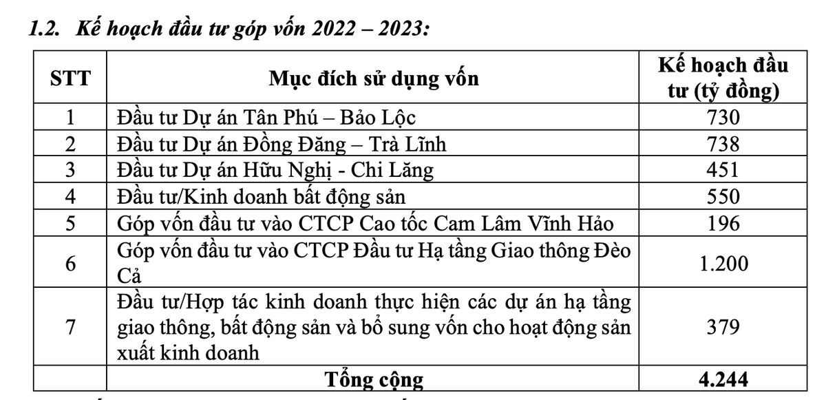 Về kế hoạch đầu tư góp vốn năm 2022-2023 dự kiến 4.244 tỷ đồng để đầu tư cho các dự án cơ sở hạ tầng và góp vốn cổ phần vào các công ty thành viên. Trong đó, khoản đầu tư lớn nhất là 1.200 tỷ đồng góp vốn đầu tư vào CTCP Đầu tư Hạ tầng Giao thông Đèo Cả (HHV).