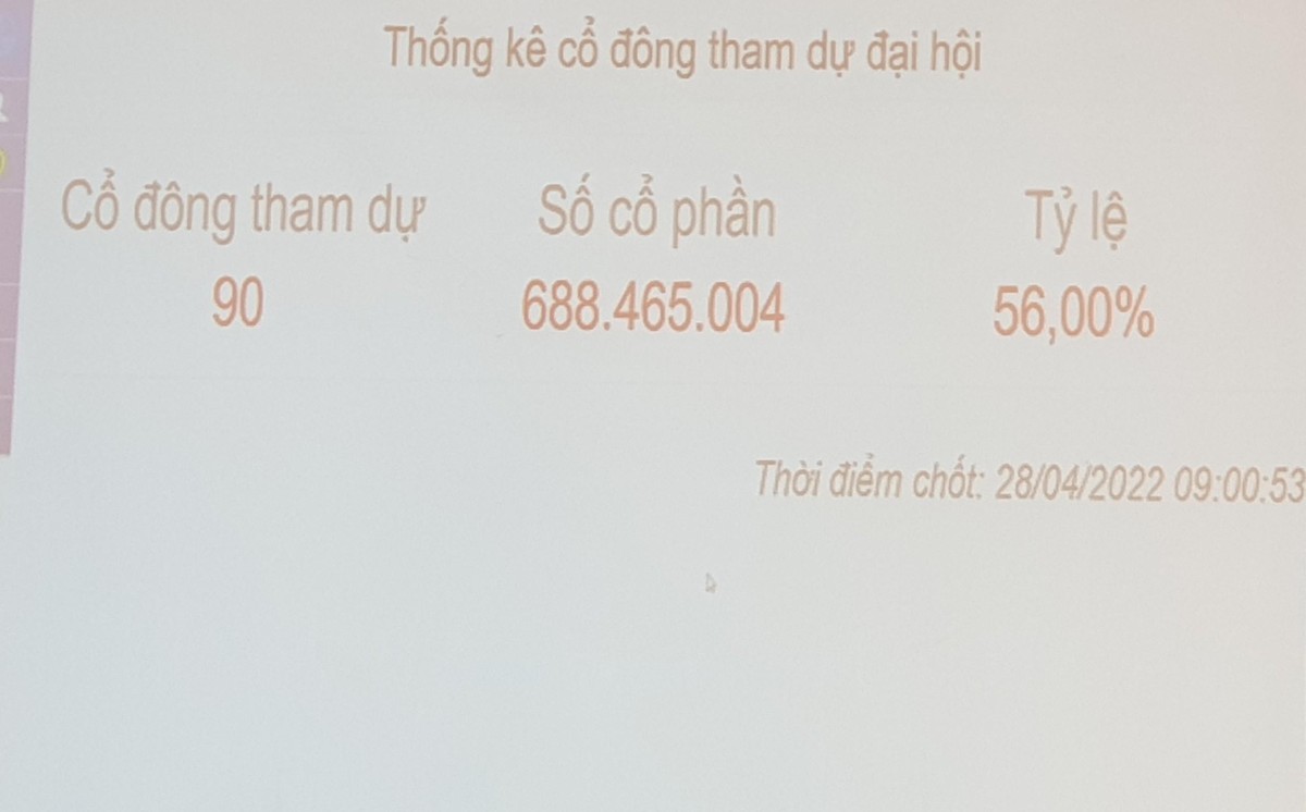 Theo đó, đến 9h, số cổ đông tham dự là 90, với tổng số trên 668 triệu cổ phần, tương đương 56% cổ đông tham gia.