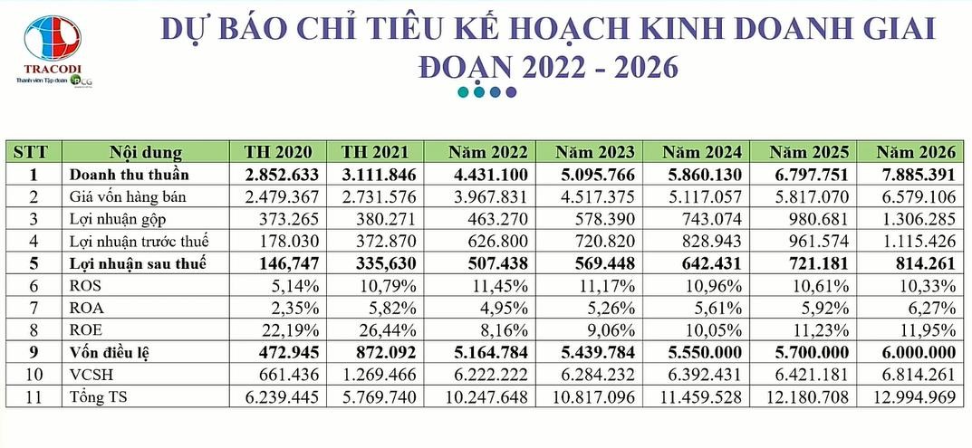 Đặc biệt, Tracodi cũng công bố kế hoạch kinh doanh dự báo giai đoạn 2022 - 2026. Theo đó, doanh thu thuần năm 2026 của TCD sẽ đạt hơn 7.885,39 tỷ đồng, lãi sau thuế hơn 814,26 tỷ đồng. Vốn điều lệ kỳ vọng sẽ tăng từ 5.164,7 tỷ đồng năm 2022 lên 6.000 tỷ đồng năm 2026.