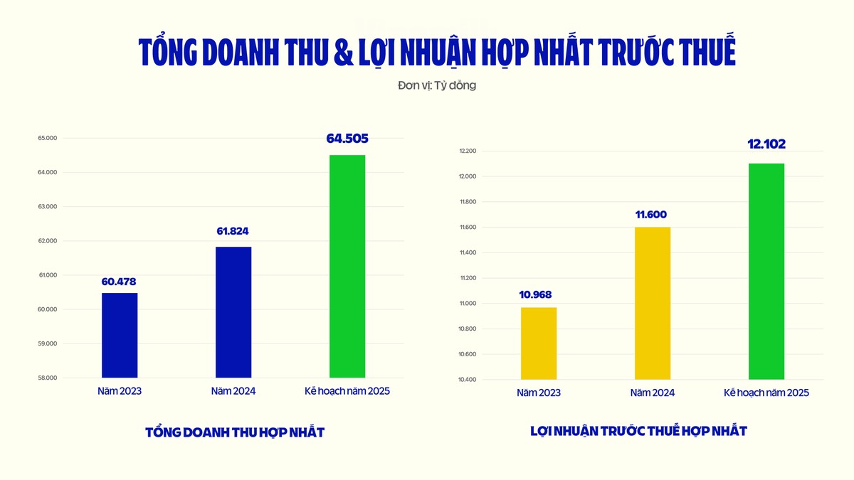 Căn cứ theo tình hình thực tế và các dự báo, cũng như các mục tiêu chiến lược cho năm 2025, Vinamilk tiếp tục đặt mục tiêu tăng trưởng 4,3% về tổng doanh thu hợp nhất, tương đương 64.505 tỷ đồng và tăng 4,3% về lợi nhuận trước thuế, đạt mức 12.102 tỷ đồng. Tỷ lệ chia cổ tức bằng tiền mặt dự kiến tối thiểu bằng 50% kế hoạch lợi nhuận sau thuế hợp nhất 2025. Nguồn chi trả sẽ lấy từ “Lợi nhuận sau thuế chưa phân phối” trên báo cáo tài chính của Công ty được công bố theo quý gần nhất trước ngày chi trả.