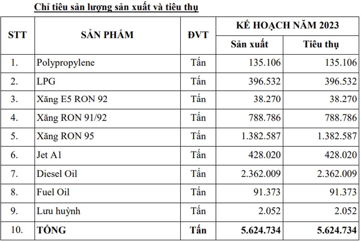 Năm 2023, Công ty đặt kế hoạch kinh doanh tổng doanh thu đạt 95.644,8 tỷ đồng, giảm gần 43% so với thực hiện năm trước và lợi nhuận sau thuế đạt 1.628,4 tỷ đồng, giảm gần 89% thực hiện năm trước. BSR đặt kế hoạch sản lượng hơn 5,62 triệu tấn thành phẩm, trong đó cao nhất là dầu diesel chiếm hơn 2,36 triệu tấn, tiếp theo là xăng RON 95 đạt 1,38 triệu tấn, RON 91/92 gần 788,8 nghìn tấn.