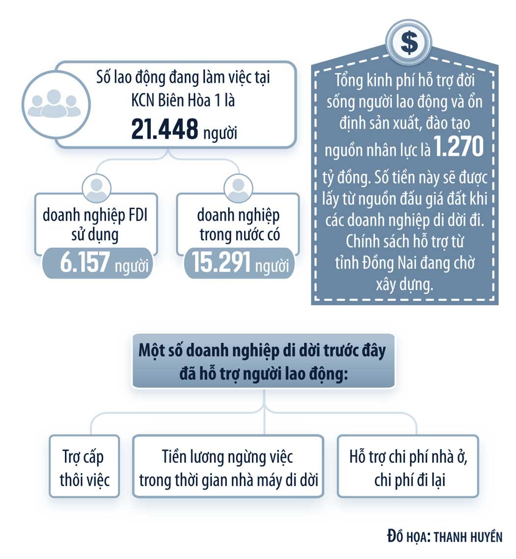Theo tìm hiểu của phóng viên Báo Đầu tư, một số nhà máy di dời khỏi KCN Biên Hòa 1 trước đây đã hỗ trợ công nhân tiền trợ cấp thôi việc, tiền lương ngừng việc trong thời gian di dời. Với lao động đi theo công ty đến địa điểm mới, doanh nghiệp hỗ trợ nhà ở, bố trí xe đưa đón.