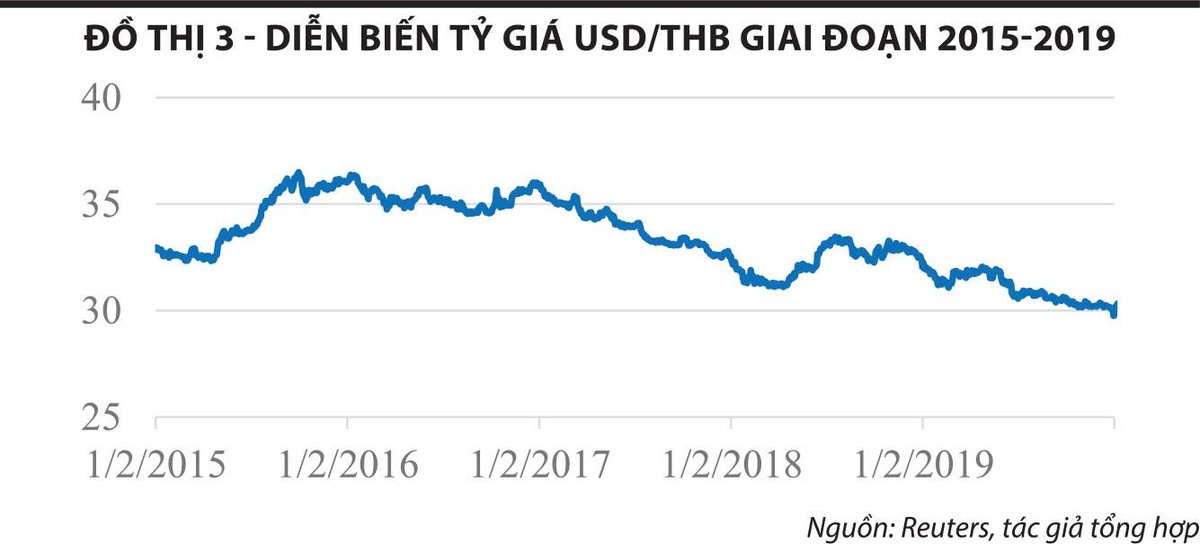 Lo ngại VND mất giá mạnh so với USD - điều đó có lẽ đã tạm thời đi vào dĩ vãng! Chứng kiến sự ổn định của tỷ giá USD/VND - điều đó cũng đã trở nên hết sức quen thuộc! Một câu hỏi mà chúng tôi muốn đặt ra là liệu có chăng một trạng thái “bình thường mới” đang dần được xác lập là VND sẽ tăng giá rõ nét so với USD, tương tự những gì đã từng diễn ra với đồng Nhân dân tệ (CNY) giai đoạn 2005-2014 hay đồng Baht Thái (THB) giai đoạn 2015-2019 (đồ thị 2 và 3).
