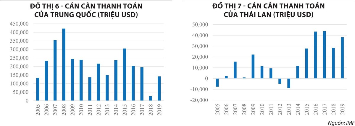 Thứ hai, khả năng tích lũy ngoại tệ cho nền kinh tế là động lực quan trọng tác động trực tiếp đến xu hướng tăng giá của một đồng tiền nội tệ. Trong quá khứ, những giai đoạn tăng giá của đồng CNY hay THB cũng đều gắn liền với việc cán cân thanh toán thặng dư một cách ổn định (đồ thị 6-7).