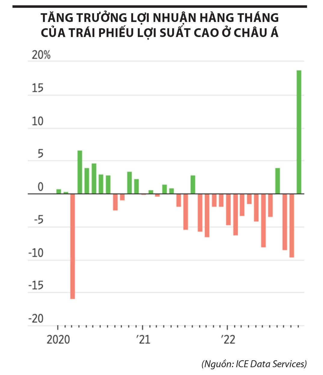 Một thông tin quốc tế đáng chú ý khi dữ liệu của ICE Data Services (Mỹ) công bố tuần trước cho thấy, tổng lợi nhuận trái phiếu lợi suất cao của châu Á đã tăng 18% trong tháng 11/2022, bao gồm tăng giá và thanh toán lãi. Đây là tháng tốt nhất của thị trường này trong hơn 10 năm qua.
