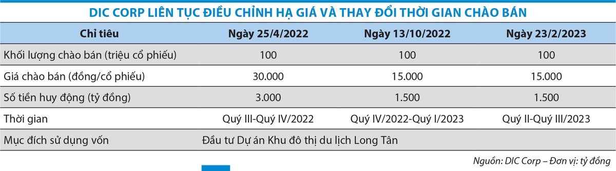 Bên cạnh việc hạ giá và kéo dài thời gian chào bán tối đa 6 tháng, DIC Corp còn điều chỉnh nội dung huy động vốn. Theo đó, số vốn dự kiến dùng để đầu tư vào dự án Long Tân vẫn là 1.500 tỷ đồng, nhưng chi tiết khoản chi cho dự án này được điều chỉnh: chi phí bồi thường, giải phóng mặt bằng được điều chỉnh từ 780 tỷ đồng lên 1.000 tỷ đồng; chi phí xây lắp được điều chỉnh từ 250 tỷ đồng lên 300 tỷ đồng và giữ nguyên mục đích huy động sử dụng đất là 200 tỷ đồng.
