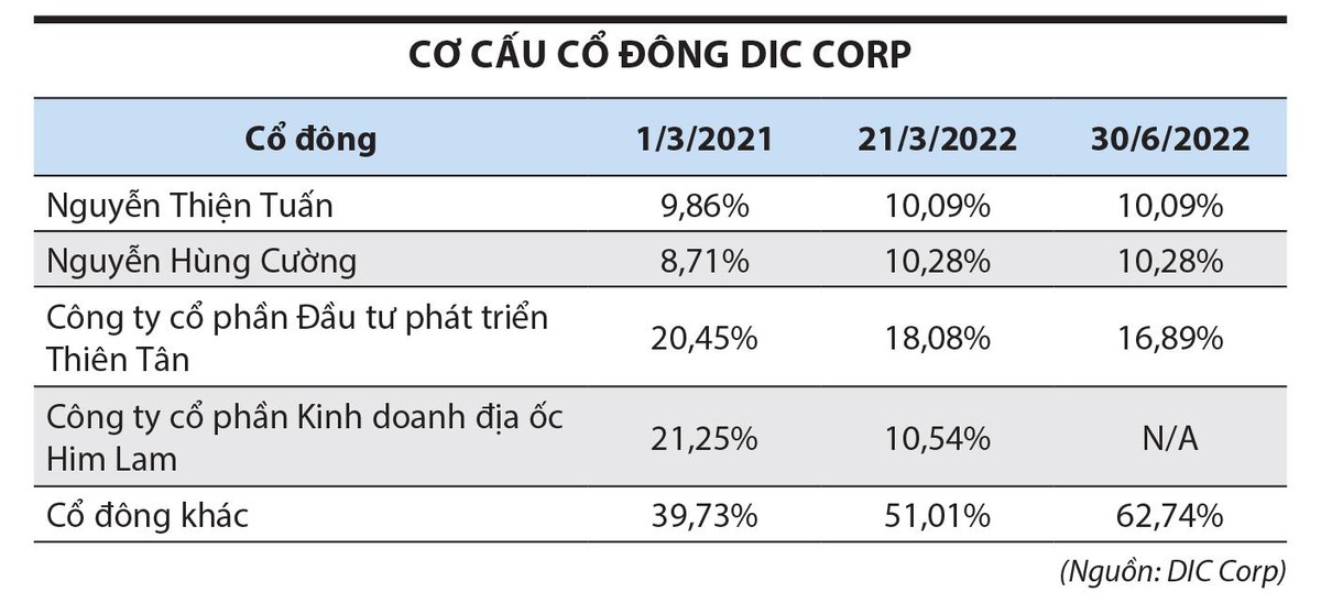 Tranh thủ giá cổ phiếu tăng cao, 2 cổ đông lớn của DIC Corp liên tục bán ra cổ phiếu và giảm mạnh tỷ lệ sở hữu. Trong đó, Công ty cổ phần Kinh doanh địa ốc Him Lam đã giảm sở hữu từ 21,25% về còn 4,99% vốn điều lệ và không còn là cổ đông lớn; Công ty cổ phần Đầu tư phát triển Thiên Tân cũng giảm tỷ lệ nắm giữ từ 20,45% về mức 16,89% vốn điều lệ.