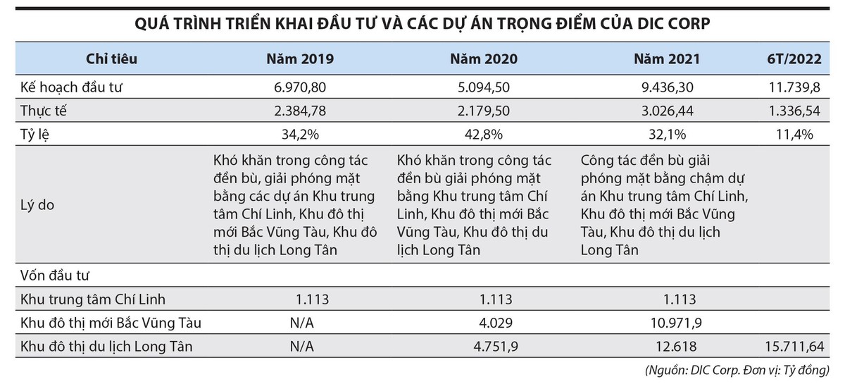 Trong nhiều năm trở lại đây, DIC Corp liên tục đặt kế hoạch giải ngân vốn đầu tư lớn nhưng tỷ lệ đầu tư thực tế không cao. Cụ thể, năm 2019 tỷ lệ giải ngân là 34,2%; năm 2020 là 42,8%; năm 2021 là 32,1% và 6 tháng đầu năm 2022 mới đạt 11,4%.