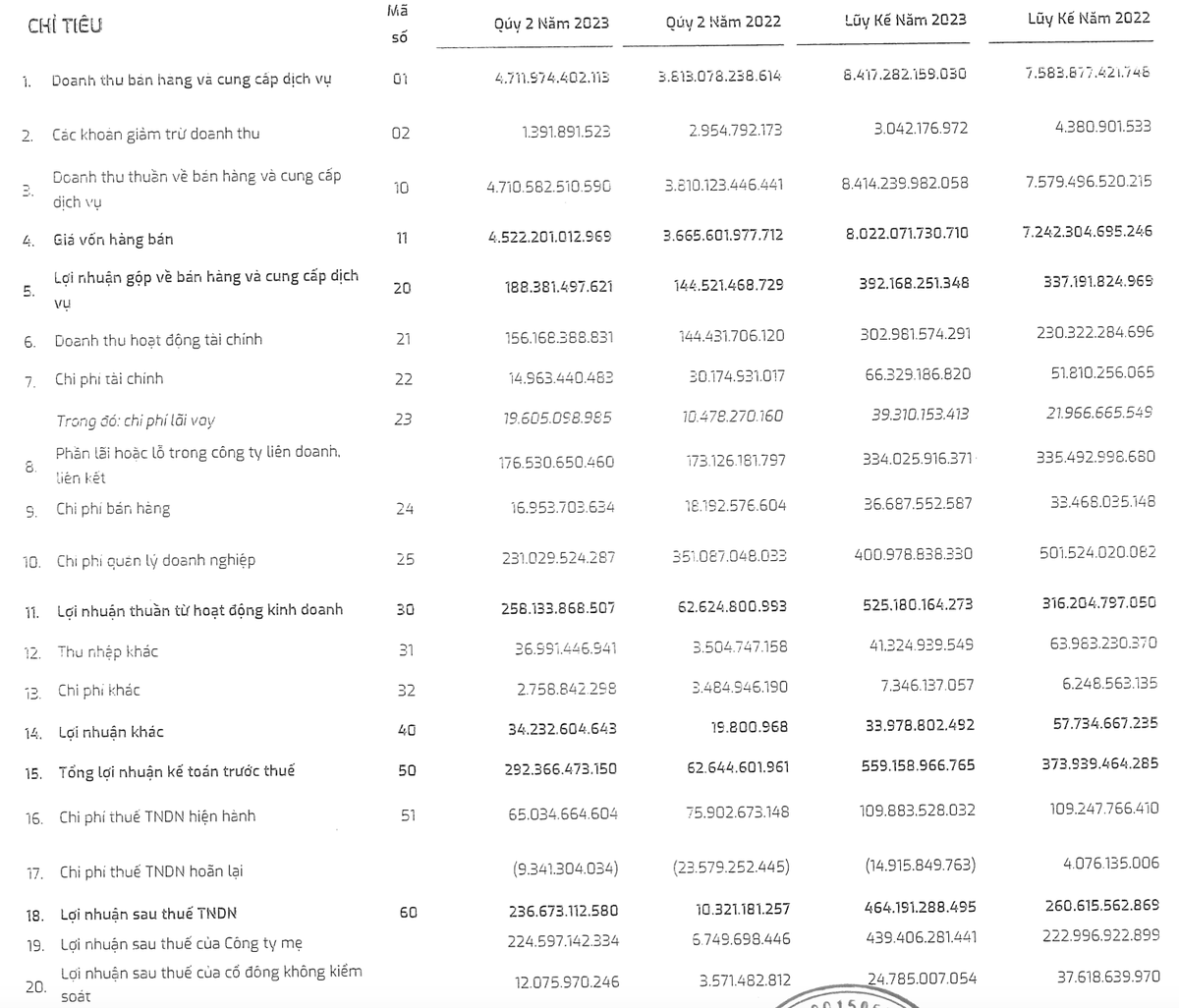 Trong quý II, doanh thu thuần doanh nghiệp đạt 4.710,6 tỷ đồng, tăng 24% so với cùng kỳ năm ngoái. Giá vốn cũng tăng 23,3%, lên 4.522 tỷ đồng, do đó, lợi nhuận gộp doanh nghiệp đạt gần 188,4 tỷ đồng, tăng 30,4%.