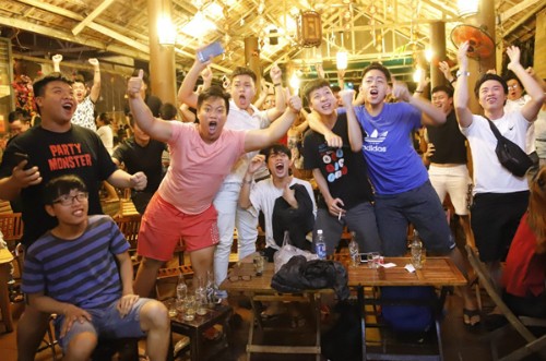 Cổ động viên tại Đà Nẵng vui mừng với bàn thắng của tuyển Việt Nam trong trận gặp Syria tại một quán cafe. Ảnh: Văn Đông.