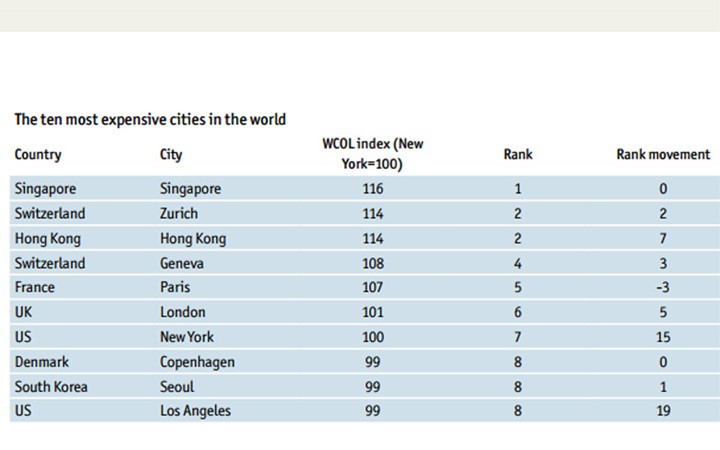 Economist Intelligence Unit vừa công bố điều tra về chi phí sống trên khắp thế giới năm 2016 dựa trên số liệu về giá cả và dịch vụ tại 133 thành phố tham gia khảo sát. Trong đó, Singapore, Zurich, Geneva, Paris, London, New York... được đánh giá là những thành phố đắt đỏ nhất thế giới năm 2016.