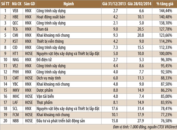 Theo thống kê sơ bộ của Đầu tư Chứng khoán đối với cổ phiếu đang niêm yết trên 2 Sở, đã có 168 cổ phiếu đạt mức tăng trên 30% trong 2 tháng đầu năm, 54 cổ phiếu đạt mức tăng trên 50% và 8 cổ phiếu tăng trên 100%.
