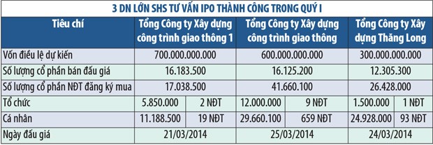 Với gần 30 DN thực hiện IPO quý I, cả nước còn trên 400 DNNN sẽ IPO từ nay đến hết năm 2015. Từ thực tế cổ phần hóa quý I cho thấy, việc chọn được nhà tư vấn tốt, hiểu DN, hiểu ngành, có hệ thống đối tác lớn, là yếu tố tiên quyết giúp các DNNN, đặc biệt là DNNN lớn, thực hiện IPO thành công.