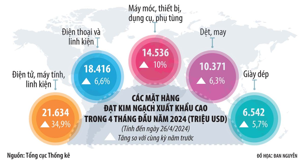 Tính chung trong 4 tháng đầu năm, cả nước có 21 mặt hàng đạt kim ngạch xuất khẩu trên 1 tỷ USD, chiếm 86,4% tổng kim ngạch xuất khẩu (trong đó, 5 mặt hàng xuất khẩu trên 5 tỷ USD, chiếm 57,8%).