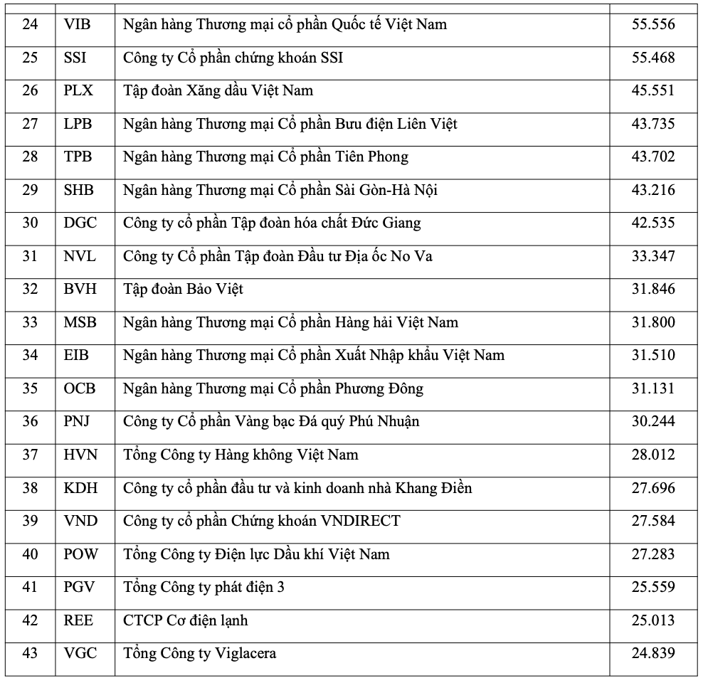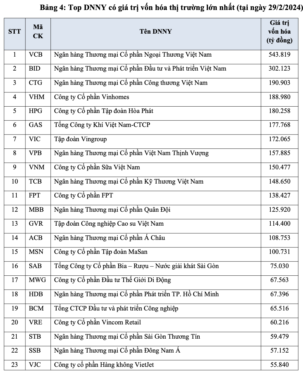 Đến hết tháng 02/2024, trên HOSE có 43 doanh nghiệp có vốn hóa hơn 1 tỷ USD. Danh sách cho thấy 2 doanh nghiệp có vốn hóa lớn nhất và trên 10 tỷ USD là Ngân hàng TMCP Ngoại thương Việt Nam (VCB) và Ngân hàng TMCP Đầu tư và Phát triển Việt Nam (BID), đây cũng là hai ngân hàng giữ nguyên vị trí top đầu từ cuối 2023.