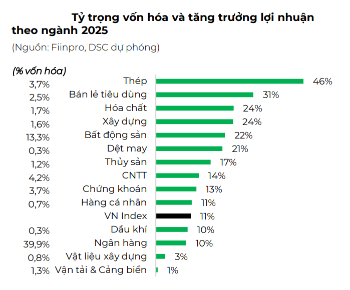 Theo DSC dự phóng, Ngân hàng sẽ chiếm tới 39,8% tỷ trọng lợi nhuận toàn thị trường, và 4,4% mức tăng trưởng lợi nhuận năm 2025 toàn thị trường. Tuy nhiên những ngành có mức tăng trưởng lợi nhuận lớn nhất lại là Thép, Bán lẻ, Hóa chất, và Xây dựng.
