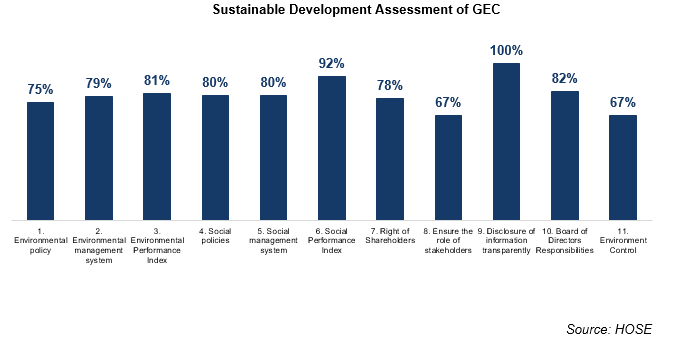 Cổ phiếu GEG đã được lựa chọn vào danh sách Đánh giá Phát triển Bền vững từ Sở GDCK TP.HCM (HOSE) và đạt Tổng điểm đánh giá Môi trường - Xã hội – Quản trị (ESG) là 80%, cao hơn mức 60% của trung bình ngành.