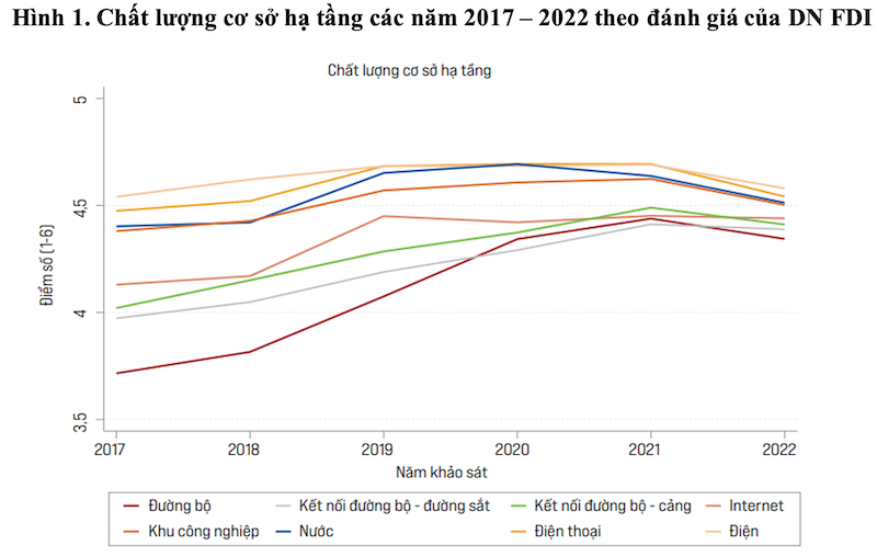 Lĩnh vực điện năng tiếp tục được 1.300 doanh nghiệp FDI đánh giá cao nhất trong chất lượng cơ sở hạ tầng năm 2022. Chất lượng điện là lĩnh vực tiếp tục nhận được sự đánh giá tích cực của các doanh nghiệp FDI trong nhiều năm qua.