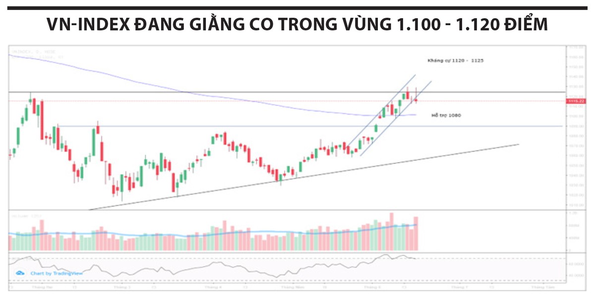 Chỉ số có khả năng điều chỉnh sau nhịp tăng điểm ngắn hạn do nhiều yếu tố như tâm lý chốt lời tăng dần quanh vùng giá 1.100 - 1.120 điểm; diễn biến giằng co tạo ra nến các phiên trong tuần tăng/giảm đan xen, vận động trong mẫu hình kênh giá tăng, biên độ của kênh hẹp và dốc; phiên ngày 16/6/2023 có khối lượng tăng mạnh cùng với diễn biến giá giảm xác nhận đỉnh ngắn hạn của VN-Index; chỉ báo RSI tiến vào vùng quá bán và tạo phân kỳ âm với giá cho thấy sức mạnh giá đang yếu đi.