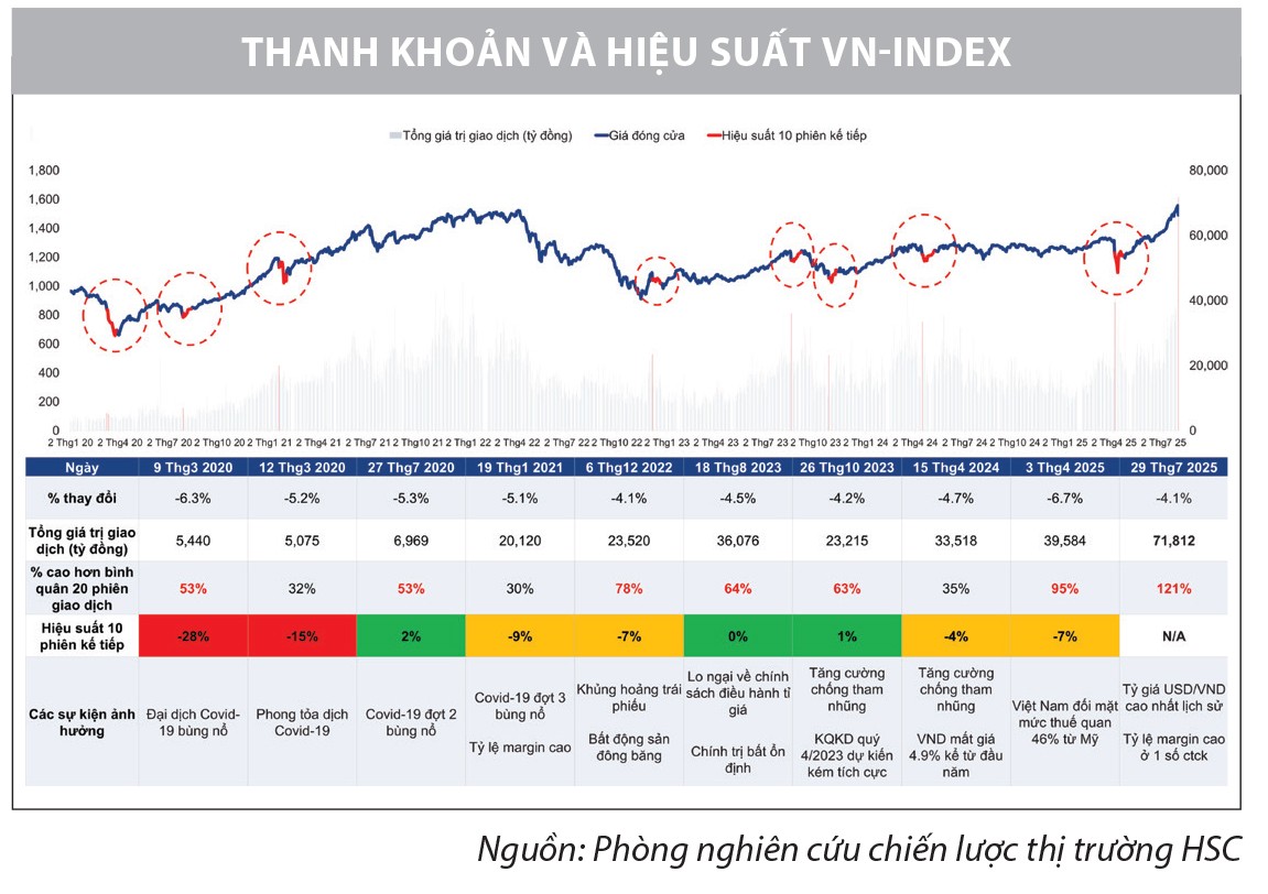 Hầu hết các trường hợp này chỉ là điều chỉnh ngắn hạn, ngoại lệ duy nhất là đợt lao dốc do dịch Covid-19 - một sự kiện mang tính bất thường. Cũng cần lưu ý, rằng thị trường đã tăng mạnh từ đầu tháng 7/2025, với nhiều cổ phiếu ghi nhận mức tăng hai chữ số, giá trị giao dịch bình quân mỗi ngày (không tính thỏa thuận) thường xuyên vượt mốc 30.000 tỷ đồng.