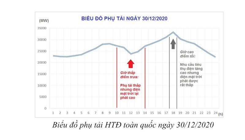 Mặt khác, vào giờ cao điểm tối (khoảng từ 17h30-18h30) là thời điểm mà nhu cầu tiêu thụ điện cao nhất trong ngày, hệ thống điện cần một lượng công suất phát điện khá lớn nhưng lúc này khả năng đáp ứng của hàng chục nghìn MW điện mặt trời hầu như không còn. Vì vậy, để đảm bảo cung cấp điện, hệ thống điện luôn cần phải duy trì sẵn sàng một số tổ máy phát điện truyền thống.