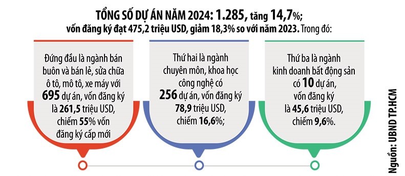Số liệu công bố của UBND TP.HCM cho thấy, năm 2024, tổng vốn đầu tư trực tiếp nước ngoài (FDI) vào Thành phố chỉ đạt 2,2 tỷ USD, giảm 39,5% so với năm 2023.