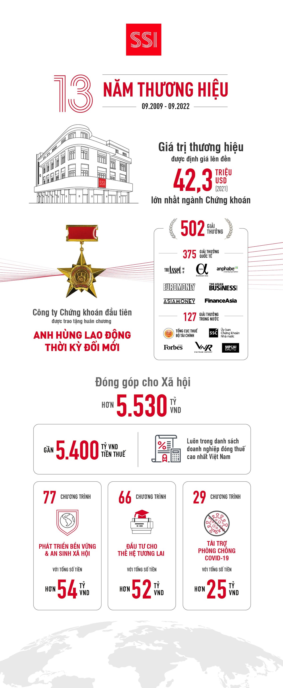 Theo Forbes Việt Nam năm 2021, giá trị thương hiệu SSI hiện được định giá lên đến 42,3 triệu USD, top đầu ngành chứng khoán khu vực Đông Nam Á. SSI cũng là cái tên thường xuyên được vinh danh trong “Top 50 thương hiệu giá trị nhất Việt Nam” do Forbes Việt Nam bình chọn. Chuyên môn vượt trội và chất lượng dịch vụ đẳng cấp của SSI được cộng đồng nhà đầu tư và chuyên gia quốc tế công nhận qua loạt thành tựu 502 giải thưởng uy tín. Qua các thành tựu của mình, SSI đặt ra những tiêu chuẩn cao hơn, cạnh tranh hơn trong ngành nhằm đem đến những dịch vụ cải tiến, chất lượng cho nhà đầu tư.