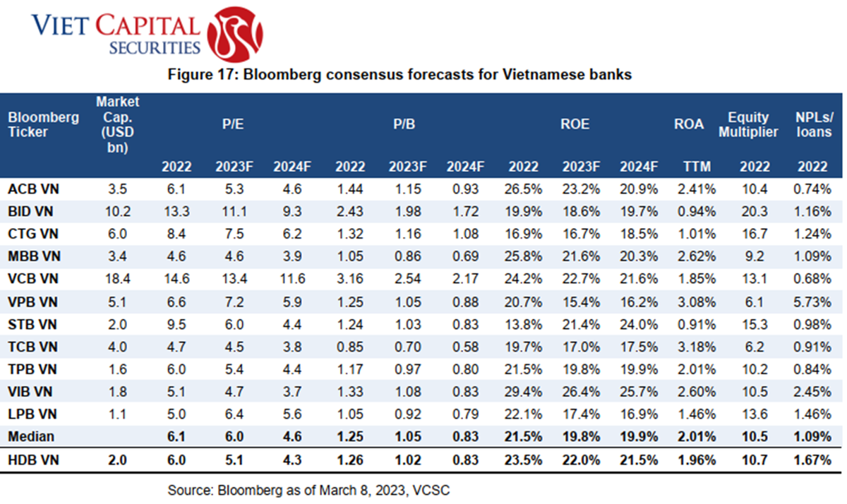 Để có cơ sở nhận định chắc chắn hơn về cơ hội đầu tư vào cổ phiếu HDB với kỳ vọng tăng trên 30%, VCSC đã dự phóng số liệu năm 2023, 2024 của các ngân hàng đồng thời dự phóng P/E năm 2023, 2024 của HDB lần lượt là 5.1 lần và 4.3 lần, cả 2 chỉ số này đều thấp hơn con số bình quân ngành. Số liệu P/B dự phóng 2023, 2024 của đạt lần lượt là 1.02 lần và 0.83 lần.