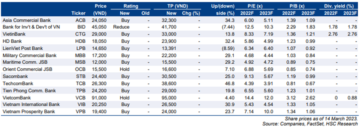 Cùng chung quan điểm cổ phiếu HDB có thể tăng giá trên 30%, phương pháp luận để lựa chọn cổ phiếu ngân hàng của Chứng khoán HSC còn tính thêm tính ổn định của ngân hàng. HSC cho rằng, trong bối cảnh nền kinh tế toàn cầu đang chịu nhiều khủng hoảng do tác động từ sự sụp đổ của một số ngân hàng nước ngoài thì việc lựa chọn cổ phiếu ngân hàng để đầu tư cần quan tâm đầu tiên là mức độ ổn định của từng ngân hàng trong đó yếu tố cơ sở tiền gửi đa dạng, ổn định và ít đầu tư vào chứng khoán là 2 yếu tố lớn nên xem xét.