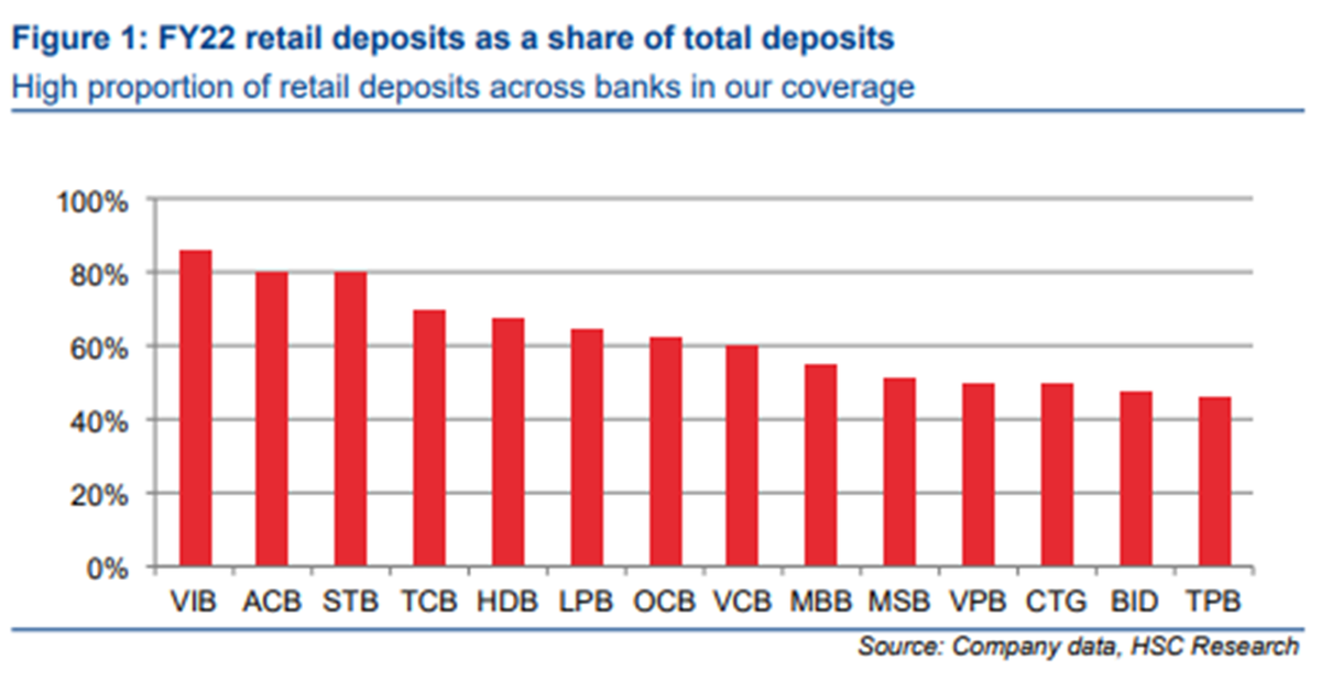 HSC cũng đưa ra dữ liệu cho thấy, top 5 ngân hàng có tỷ lệ tiền gửi cá nhân cao, đạt trên 60% là VIB, ACB, STB, TCB và HDB.