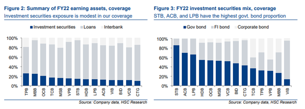 Đối với chất lượng tài sản, 5 ngân hàng đầu tư nhiều vào trái phiếu chính phủ với mức độ an toàn cao là STB, ACB, LPB, HDB và OCB. Những ngân hàng thương mại có tỷ lệ đầu tư vào chứng khoán nói chung ở mức thấp là CTG, VCB, BID, VIB, ACB, LPB, HDB và STB.