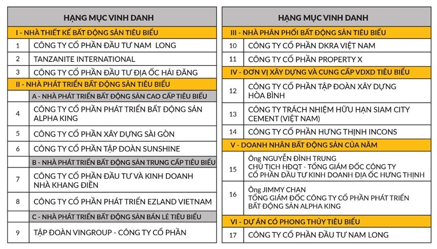 Với những giá trị nổi bật mang lại cho thị trường bất động sản và cộng đồng, các đơn vị được trao giải thưởng năm nay cũng là những thương hiệu uy tín và quen thuộc trên thị trường.