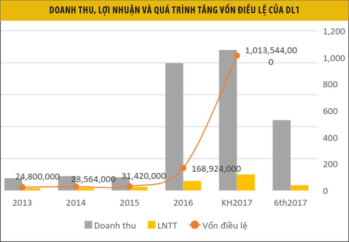 Đáng chú ý, đây là năm thứ 2 liên tiếp DL1 tăng vốn khủng. Năm 2016, Công ty cũng tăng vốn gấp 5 lần, từ 31,4 tỷ đồng lên 168,9 tỷ đồng qua chia tách cổ phiếu và phát hành hơn 12 triệu cổ phiếu để hoán đổi và sáp nhập CTCP Khoáng sản và luyện kim Tây Nguyên. Nếu hoàn thành đợt phát hành thành công, quy mô vốn của DL1 sẽ lên tới 1.014 tỷ đồng, tăng 28,8 lần so với số vốn cuối năm 2015.